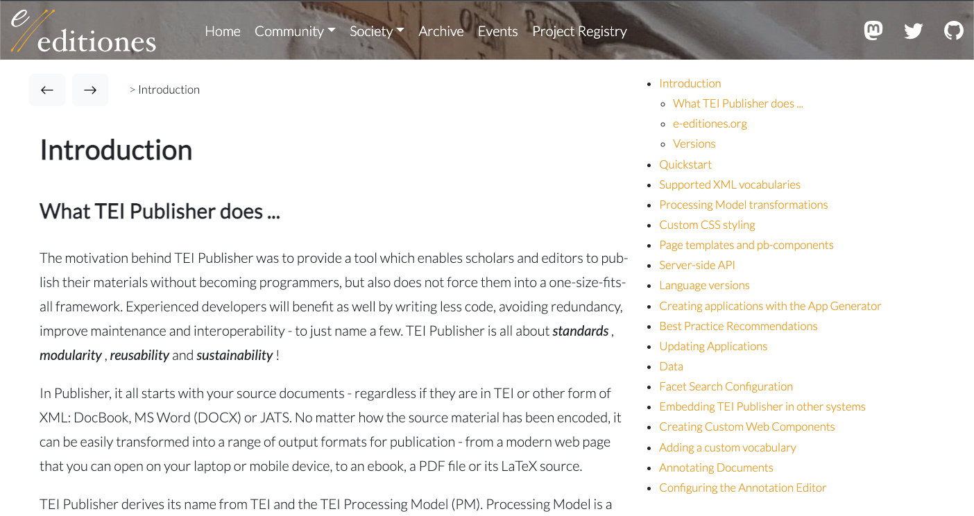 At this point you may want to browse to a (currently) hidden page on the e-editiones website. What we see there is a static version of the latest TEI Publisher documentation! And we all know that the documentation is written in Docbook XML. So how did it get there? The mystery will be revealed in a minute...