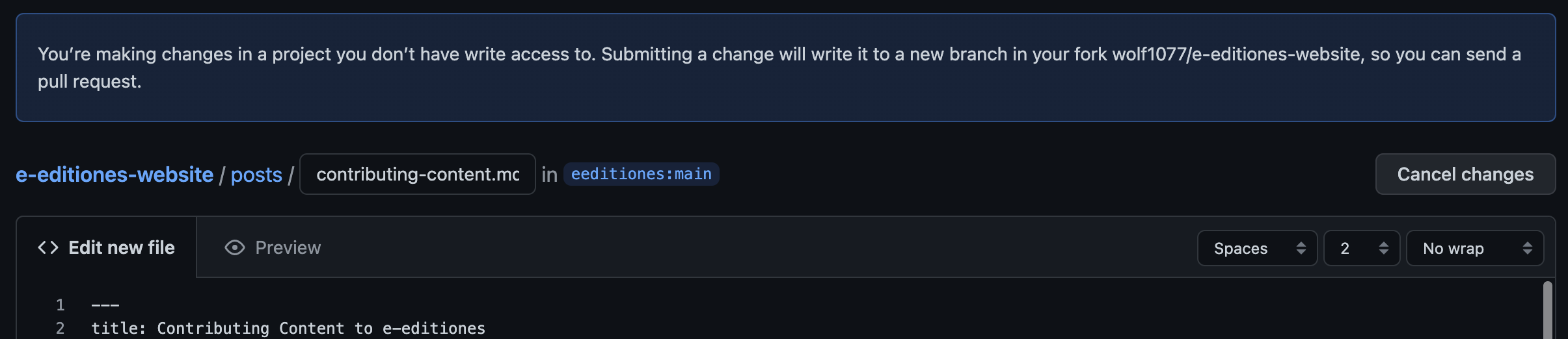 Unless you are a member of the editorial team, GitHub will warn you that you are about to make changes to a project you don't have write access to. This is ok! Your changes will result in a pull request, which will be sent to the e-editiones team for approval.