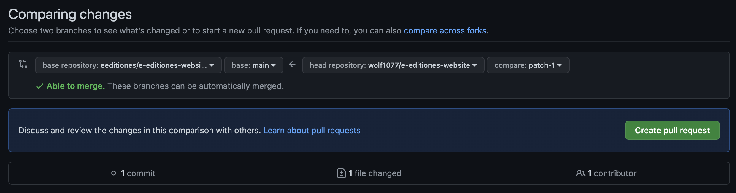 This will be followed by yet another form on which you could provide further notes concerning your contribution, but it's usually enough to just confirm once again by pressing the Create pull request button again.