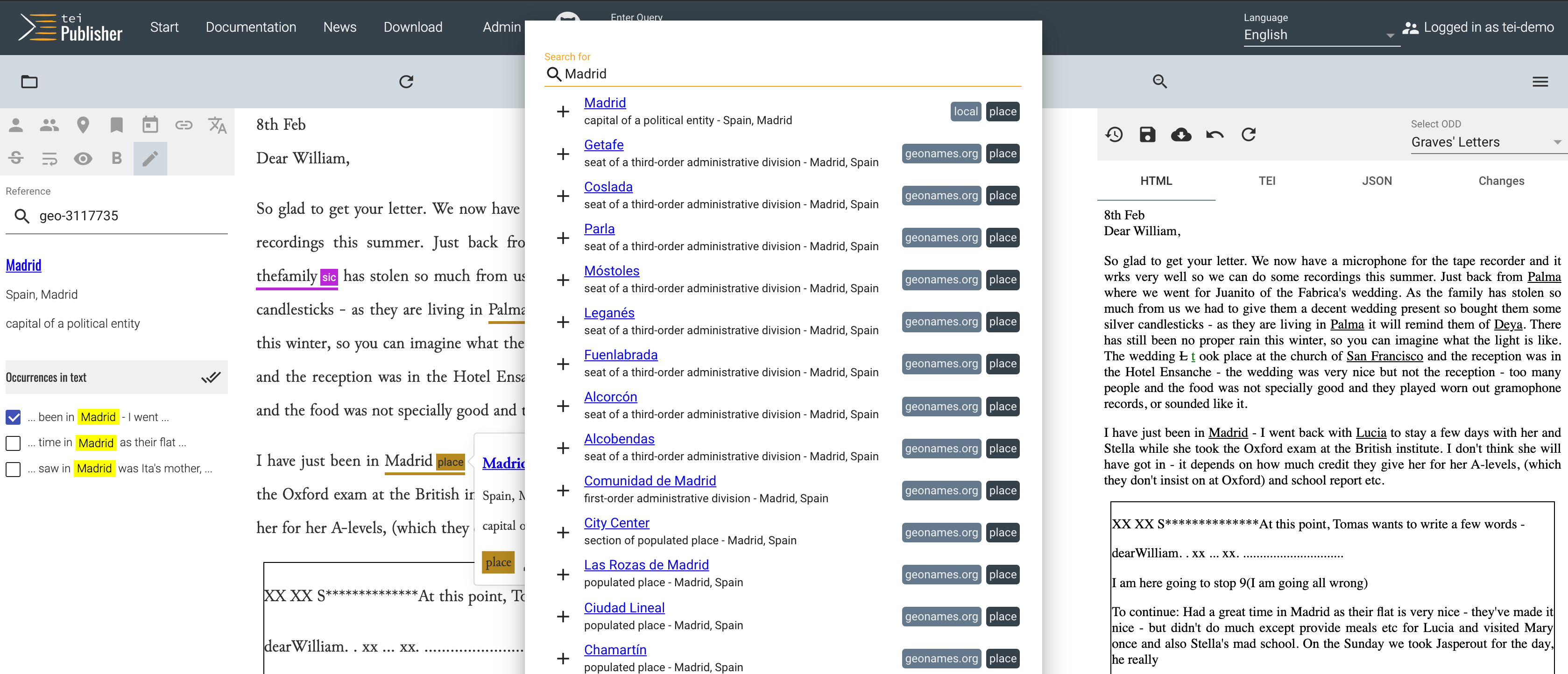 Answering the secret dream of many TEI users this new TEI Publisher version 7.1.0 incorporates a — beautifully simple to use, yet powerful — way to enrich existing TEI documents. Users can just select a text passage, click on a button and within seconds — and without a pointy bracket in sight! — mark it as one of many supported annotation types. A place or person? Sure, and with built-in connectors for external authority files, too. Critical apparatus entries? We got you! Dates, corrections, regularizations and even quick fixes for typos in your transcription.