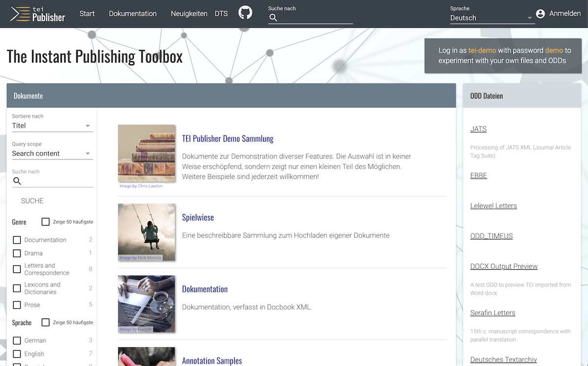 The TEI Publisher application itself shows a bunch of new examples and a redesigned start page, which blurs the boundary between browsing and search. The HTML behind the page got more modular, allowing editions to better mix and match features in the way which best fits the material presented.