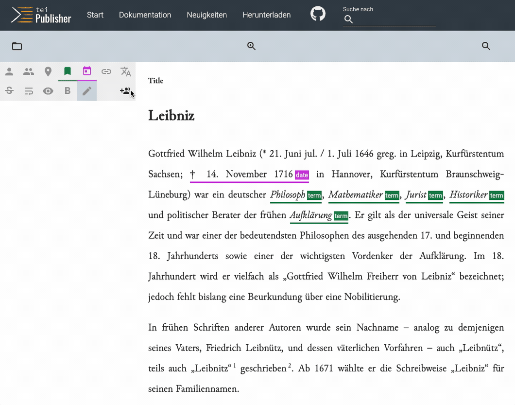 Thanks to another new library we created, TEI Publisher's web annotation editor now also includes experimental support for detecting and tagging named entities in texts. Even better, training your own model is tightly integrated with TEI Publisher: it will directly generate training data from already annotated TEI texts.