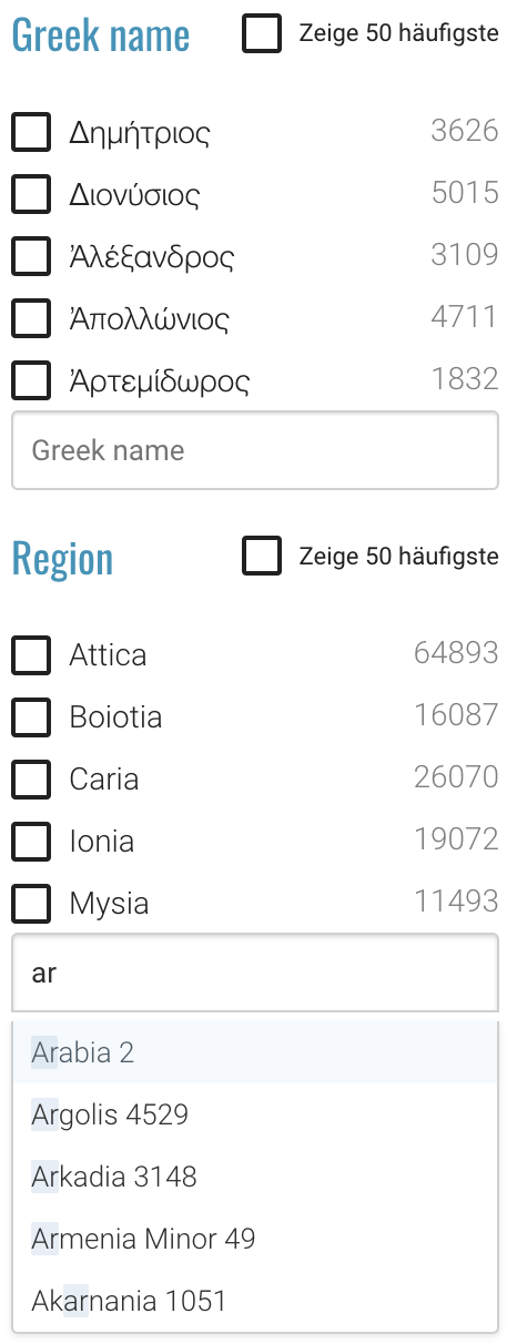 Now it became easier to select less frequent facets when browsing or searching: previously only the most frequent facets were shown by default and you had to browse through a potentially long list if you wanted to find a not so common one. Now you can easily configure the facets to display a combo box in addition to the list, allowing users to type in a query and see all the matching facets.
